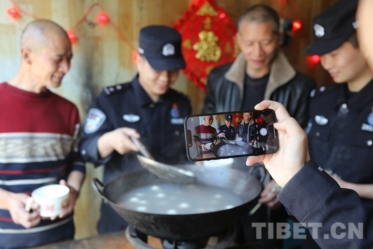 圖為民警為工人們盛湯圓,大家其樂(lè)融融 攝影:索朗次仁
