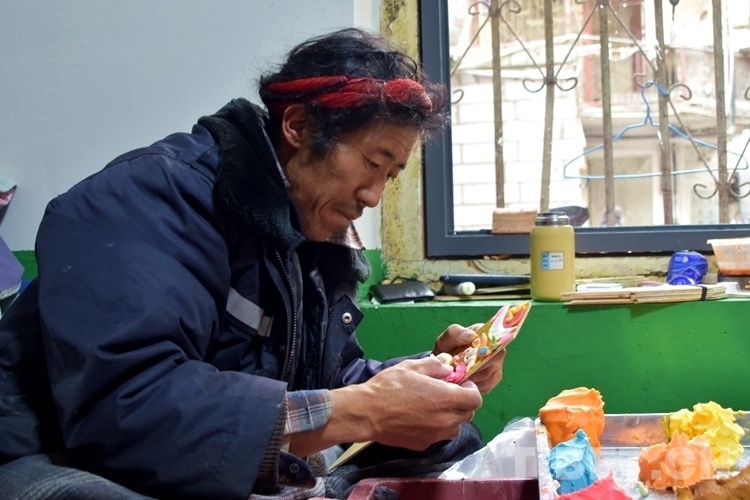 “我們一般在藏歷新年前20天左右到達拉薩。買酥油,和礦物染色原料調(diào)至成泥狀后便開始捏制。”旦增說,普松鄉(xiāng)有制作酥油花的傳統(tǒng),每年藏歷新年臨近,他們便結(jié)伴來到拉薩制作酥油花銷售。