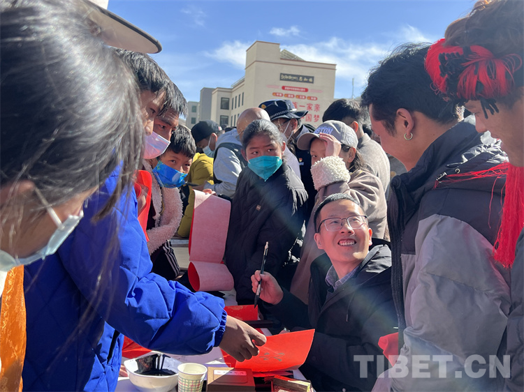 來(lái)到送“書法”現(xiàn)場(chǎng),書法家們?cè)缭绲貋?lái)到活動(dòng)現(xiàn)場(chǎng),他們準(zhǔn)備筆墨、鋪開紙張,為現(xiàn)場(chǎng)群眾書寫藏、漢文新年對(duì)聯(lián),“?!弊?、“吉祥如意”、“扎西德勒”等寓意美好的祝福。書法家協(xié)會(huì)副主席祖牛拉巴次仁說(shuō):“從春節(jié)開始,我們書法家們?nèi)W(xué)校、社區(qū)、搬遷安置點(diǎn)等地,書寫了超過(guò)1萬(wàn)件的書法作品。這些作品深受大家的喜愛,我們后續(xù)也會(huì)繼續(xù)開展送‘書法’公益活動(dòng)”。現(xiàn)場(chǎng)群眾聚集在送“書法”現(xiàn)場(chǎng),“西熱措姆”“張文青”“索朗旺青”“朗嘎達(dá)瓦”……孩子們爭(zhēng)先恐后請(qǐng)書法家把自己的名字寫在紅紙上?!斑@是我的名字,我爸是西寧人,我媽是那曲的,我們是從那曲安多縣搬遷過(guò)來(lái)的,我現(xiàn)在在森布日幸福中學(xué)上初三,將來(lái)要考那曲高級(jí)中學(xué)”張文青拿著書家贈(zèng)給她的“名字”用流利的那曲話對(duì)記者說(shuō)。