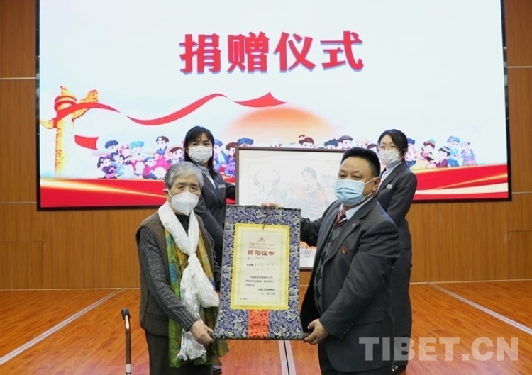 圖為中國藏學(xué)研究中心西藏文化博物館向畫家吳茜女士(左)頒發(fā)捐贈證書