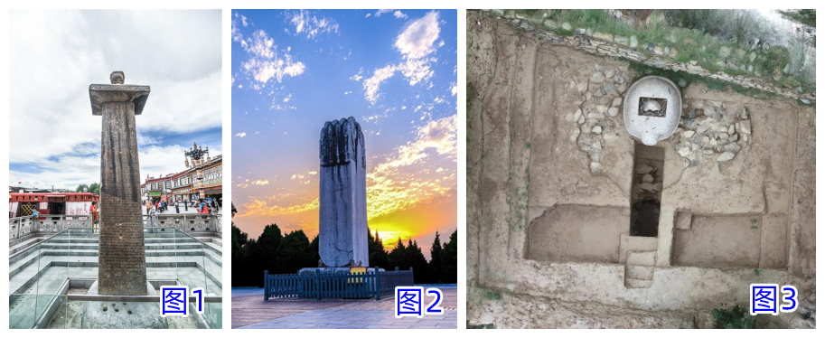 圖1為拉薩大昭寺前的唐蕃會(huì)盟碑 圖片來源:中國(guó)西藏網(wǎng);圖2為唐乾陵的無字碑 圖片來源:中國(guó)乾陵網(wǎng)站;圖3為西藏曲水溫江多遺址龜趺及房址 圖片來源:國(guó)家文物局