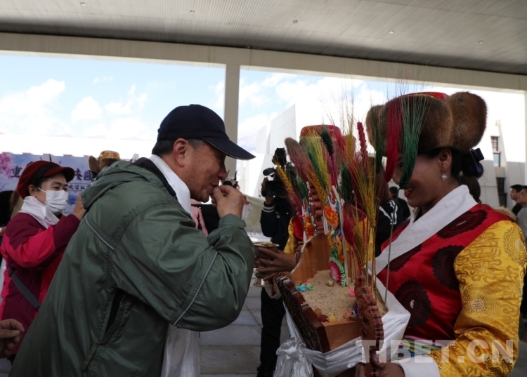 圖為歡迎儀式上,歡迎人員敬獻“切瑪”,歡迎“老西藏”。葉鵬(左)熟練地以藏族禮節(jié)回應(yīng) 攝影:王茜