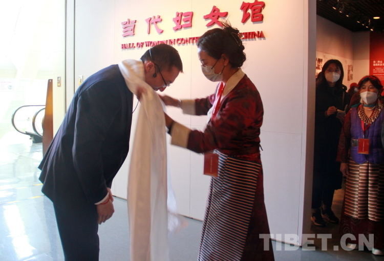圖為“2023年西藏基層婦聯(lián)干部赴京學習參觀團”成員向中國婦女兒童博物館講解員獻上哈達 攝影:劉莉