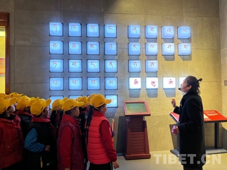 走進(jìn)“藏地智慧”,學(xué)生們一眼認(rèn)出藏文創(chuàng)始人吞彌·桑布扎,大家異口同聲回答講解員的問題說:“這是吞彌·桑布扎?!钡玫街v解員的肯定、并向他們講述背后的相關(guān)歷史后,學(xué)生們聽得很入迷,也更有信心面對接下來的問題。藏文的信息化使得這一古老文字煥發(fā)著全新而旺盛的生命力,在這里學(xué)生們欣賞藏文在智能手機(jī)、電腦、多功能點讀機(jī)等智能電子設(shè)備內(nèi)“走動”、傳統(tǒng)農(nóng)牧業(yè)的模擬場景和現(xiàn)代化的機(jī)械設(shè)備圖、藏醫(yī)藥材、藏香藏紙制造和制鹽過程等獨具特色的藏族傳統(tǒng)手工藝,也能很好的回答講解員提出的問題,現(xiàn)場互動氣氛熱烈?!斑@種活動我們學(xué)校不會常有,當(dāng)孩子們聽到要去拉薩時像是要過年那樣高興,一路上問這問那地充滿好奇?!倍喟奏l(xiāng)小學(xué)的帶隊老師羅珍介紹:“這次參加活動的這些學(xué)生都是三、四、五年級的學(xué)生,個個品學(xué)兼優(yōu)?!?/p>