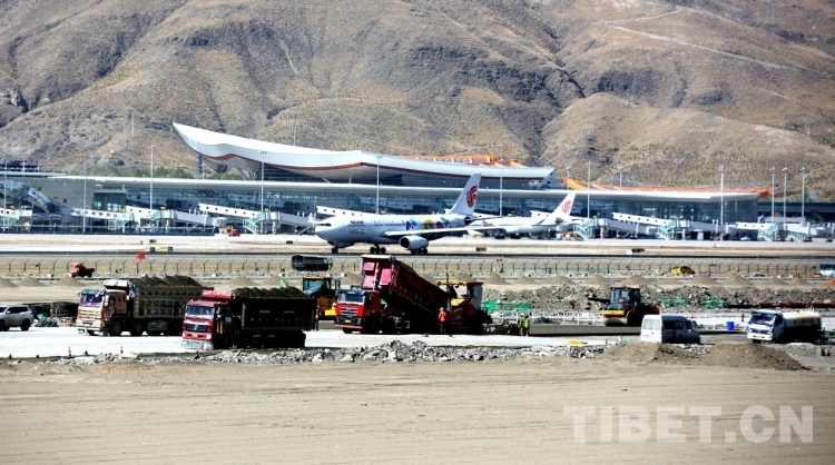 中國西藏網(wǎng)訊 各式工程機(jī)械緊張有序作業(yè),不遠(yuǎn)處一架架飛機(jī)駛遠(yuǎn)或降落……這正是西藏自治區(qū)拉薩貢嘎機(jī)場新建第二跑道工程如火如荼建設(shè)的場景。