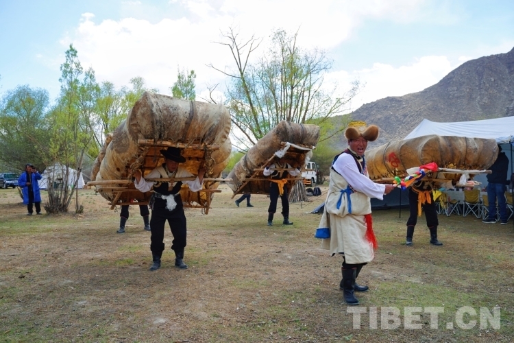 當天恰好是周六,從拉薩來體驗的游客不在少數(shù),有的是觀看了抖音直播就馬上騎車過來體驗的。在營地,大家欣賞到了當?shù)氐摹肮挝琛保ㄅFご瑁?,廓孜由邊唱邊跳的“阿熱”和身背牛皮船跳舞的“船夫”合作表演?!鞍帷笔枪挝柚械念I舞者,跳牛皮船舞時,“阿熱”手執(zhí)“塔塔”(五彩旗桿),唱著歌,跳著舞,另外4位舞者看著“阿熱”的動作,背著重約80斤的牛皮船,用同樣的動作跟著“阿熱”跳舞。大家動作整齊,船漿擊打船舷的“咚咚”聲不絕于耳。