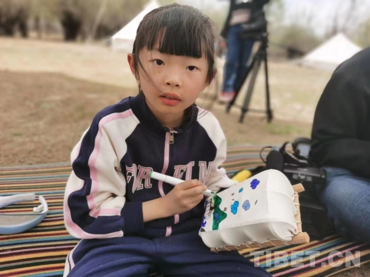 圖為小朋友在“迷你版”羊皮船上繪畫 攝影:王淑
