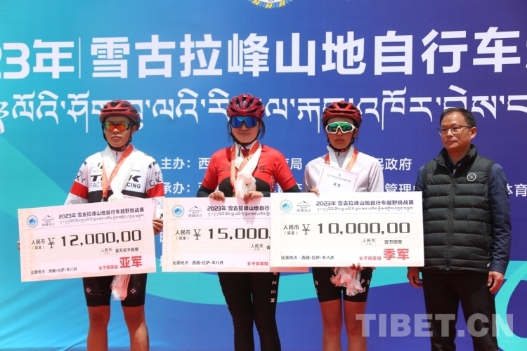 圖為獲得女子精英組比賽冠軍老隊(duì)員車隊(duì)選手白瑪央吉、亞軍區(qū)體校隊(duì)選手曲美巴措、季軍區(qū)體校隊(duì)選手索朗益西 攝影:德吉卓瑪