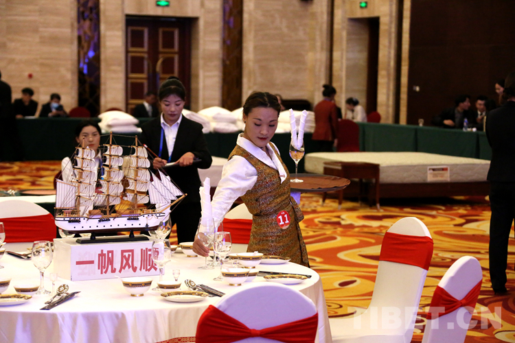 中國西藏網(wǎng)訊 5月11日,由西藏自治區(qū)旅游發(fā)展廳、西藏自治區(qū)總工會(huì)、共青團(tuán)西藏自治區(qū)委員會(huì)、西藏自治區(qū)婦女聯(lián)合會(huì)主辦,西藏旅游飯店業(yè)協(xié)會(huì)承辦的2023年西藏自治區(qū)星級(jí)飯店從業(yè)人員服務(wù)技能競賽在拉薩開賽。45名選手圍繞中餐宴會(huì)擺臺(tái)、西餐宴會(huì)擺臺(tái)、中式鋪床及夜床服務(wù)、前廳服務(wù)4個(gè)項(xiàng)目同臺(tái)競技。