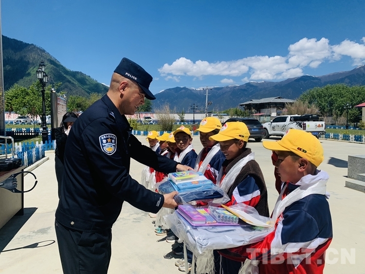 圖為林芝魯霞邊境派出所民警給小學(xué)生們送上節(jié)日小禮品