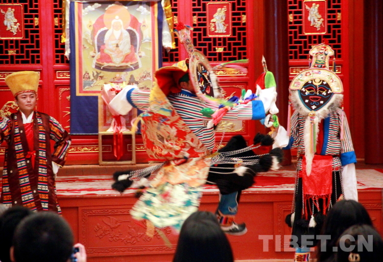 圖為拉薩市城關(guān)區(qū)娘熱民間藝術(shù)團(tuán)演員表演國家級非物質(zhì)文化遺產(chǎn)“堆諧”攝影:劉莉