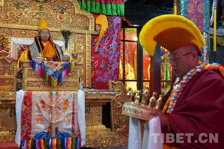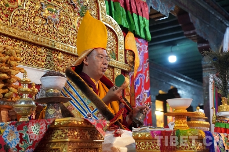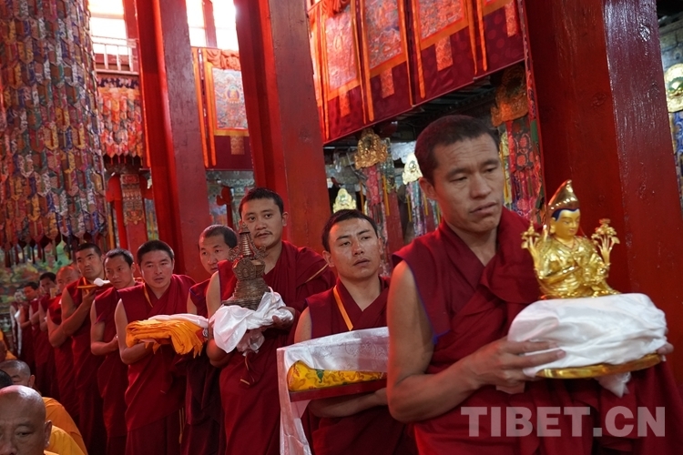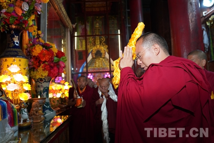 在措欽大殿內(nèi),班禪每到一座佛像前都雙手合十為眾生祈禱,并向佛像敬獻(xiàn)哈達(dá),祈求國(guó)泰民安、利樂(lè)眾生。措欽大殿內(nèi)的眾僧也并排而坐齊聲誦經(jīng)、虔誠(chéng)祝禱。禮佛后,班禪登上措欽大殿寶座,寺廟高僧代表向班禪敬獻(xiàn)曼扎(佛像、經(jīng)書(shū)、佛塔)、誦祈愿永駐贊;班禪向寺廟僧眾傳授賜予《文殊真實(shí)名經(jīng)》,并為僧眾摸頂。