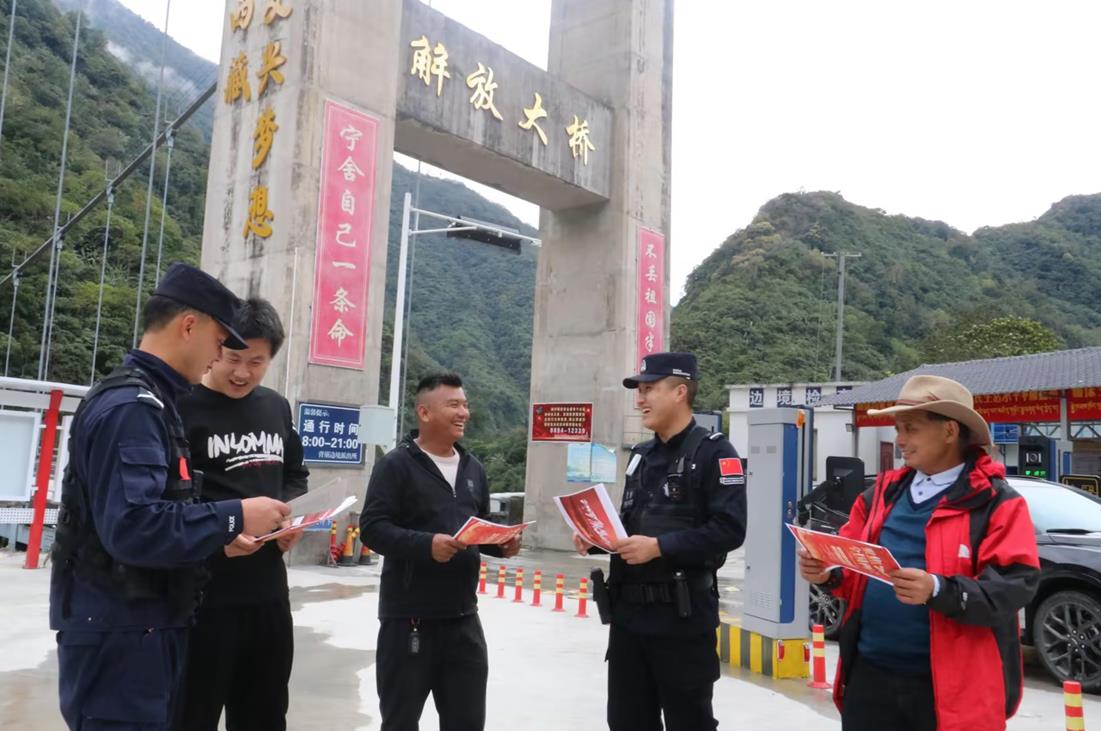 圖為背崩邊境派出所解放大橋執(zhí)勤點民警為過往群眾講解邊境條例相關知識 攝影:呂恒剛