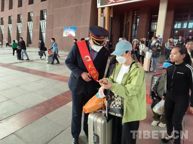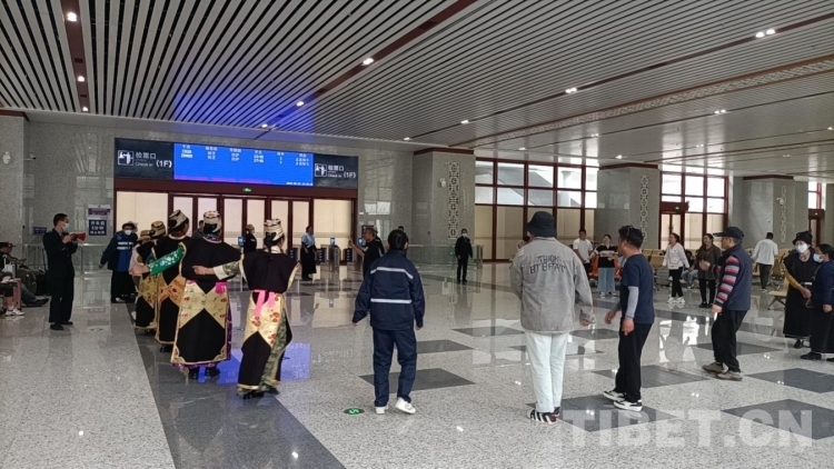 中國西藏網(wǎng)訊 2023年6月25日,拉薩火車站、林芝火車站內(nèi)異常熱鬧。在拉薩火車站,準(zhǔn)備乘坐C925次旅客列車前往林芝的旅客和車站“天路格?;ā狈?wù)隊(duì)的工作人員一起開展著競(jìng)答互動(dòng)小游戲,復(fù)興號(hào)列車紀(jì)念筆、車站卓瑪工作室卡通形象鑰匙扣、旅行雜志等小禮品深受旅客喜愛。在林芝火車站,工作人員和旅客跳起了熱情的鍋莊,用特有的方式慶祝拉林鐵路開通兩周年。