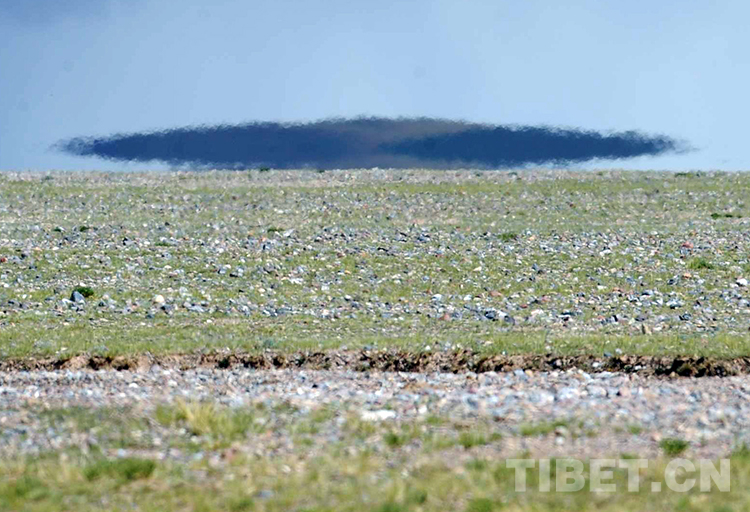 出現(xiàn)在羌塘國(guó)家級(jí)自然保護(hù)區(qū)的形似飛碟的海市蜃樓。海市蜃樓是因空氣中不斷升騰的水汽將光線折射而形成(唐召明2009年8月2日攝)