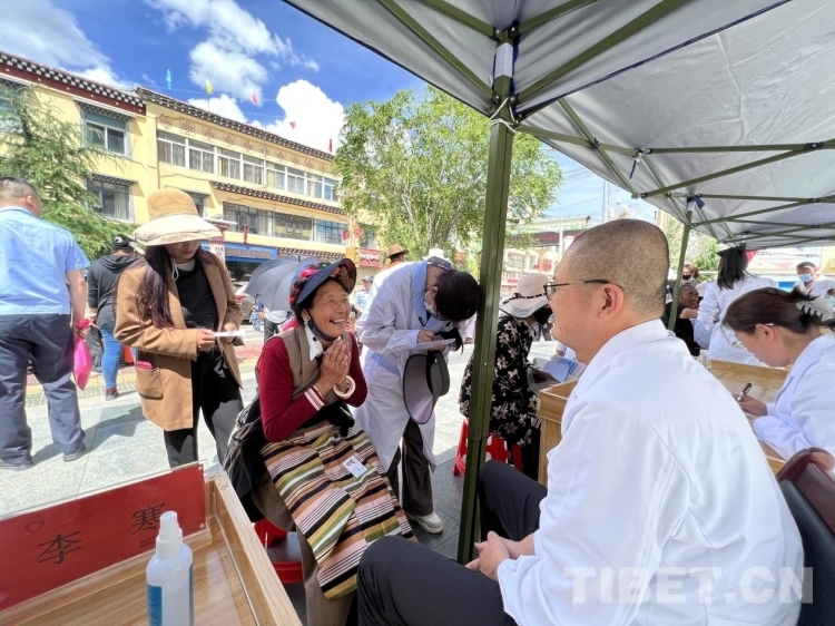 “從首都老遠(yuǎn)跑來(lái)給我們看病送藥,嘎真切(感謝)、故次仁(愿您長(zhǎng)壽)?!毕虬颓谠诠强屏x診點(diǎn)給來(lái)自北京海淀區(qū)花園路社區(qū)衛(wèi)生服務(wù)中心主任李寒看完膝蓋、胳膊、肩膀等關(guān)節(jié)病后一會(huì)兒雙手合十、一會(huì)兒舉起大拇指、一會(huì)兒又跟李醫(yī)生握手表達(dá)著心中的感謝之情。