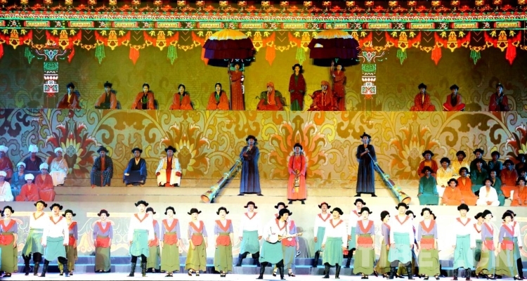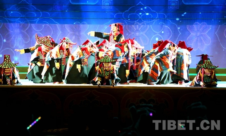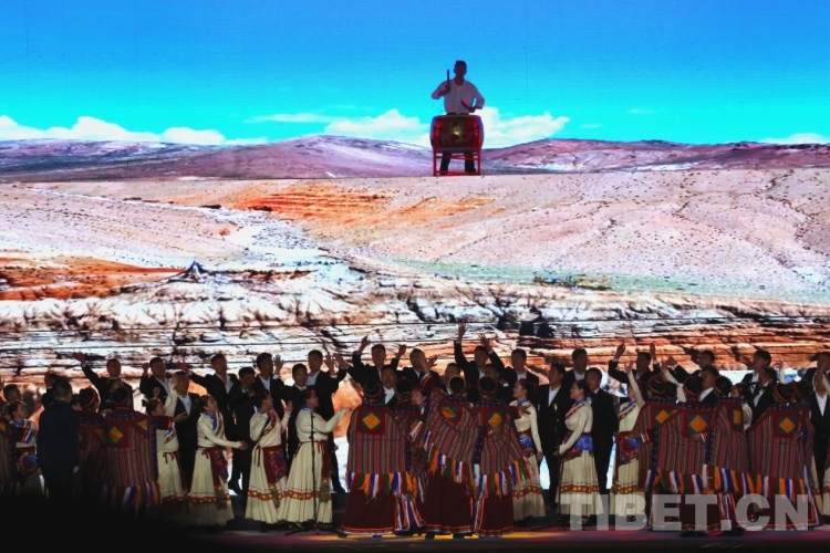 隨后盛大的開幕式文藝演出如期而至。演出共分為《悠遠(yuǎn)古韻》《詩意微芒》《如炬經(jīng)典》《輝煌盛世》四個(gè)篇章?!队七h(yuǎn)古韻》篇章為大型情景表演,結(jié)合古格壁畫為開場(chǎng)表演,展現(xiàn)出阿里人民群眾的精神面貌和獨(dú)特的阿里神韻?!对娨馕⒚ⅰ穮R集阿里地區(qū)諸多極具代表性的國(guó)家級(jí)非物質(zhì)文化遺產(chǎn)節(jié)目,展現(xiàn)阿里地區(qū)悠久燦爛的古代文明遺存?!度缇娼?jīng)典》篇章通過不同舞蹈,展現(xiàn)阿里獨(dú)具特色的民間歌舞文化。《盛世弦歌》則展現(xiàn)了阿里地區(qū)以熱情昂揚(yáng)的姿態(tài)在全力以赴推動(dòng)建設(shè)雪域高原“西部明珠”中取得的一系列可喜的成績(jī)。