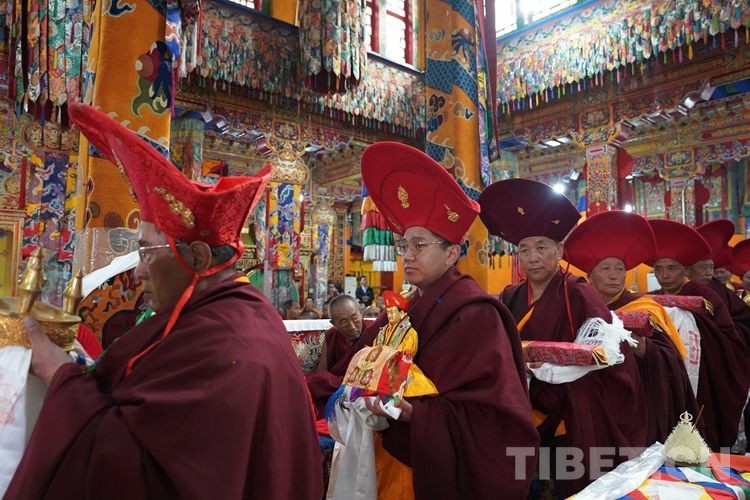 當(dāng)日11時許,在眾僧的期盼中,班禪一行抵達直孔替寺。頓時,現(xiàn)場法號齊鳴、法螺合奏,直孔瓊倉·洛桑強巴活佛和僧眾在寺廟前舉行了隆重的歡迎儀式。