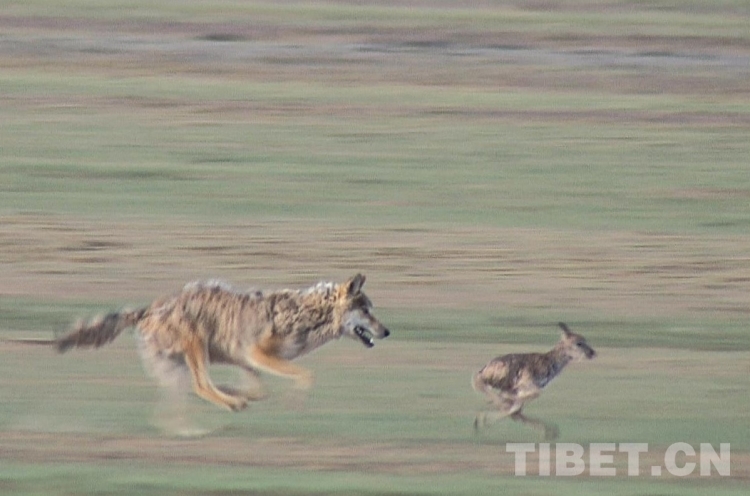圖為在羌塘自然保護(hù)區(qū),野狼正在捕食弱小的藏羚羊。攝影:達(dá)瓦次仁