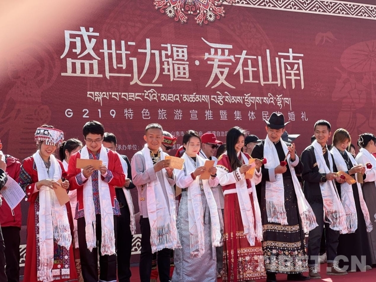 參加此次集體婚禮的新人中有來自北京、廣西、長沙、重慶等區(qū)外的游客,也有來自G219沿線縣(區(qū))的山南當(dāng)?shù)厍閭H,有漢族、藏族、彝族、苗族、回族等不同民族通婚的情侶、夫妻,他們年紀(jì)有別、身份不同、職業(yè)各異,卻都選擇來到山南奔赴這場(chǎng)浪漫之旅。在接下來的六天,他們將陸續(xù)前往山南市加查縣、隆子縣、措美縣、洛扎縣及浪卡子縣,在欣賞大美邊疆風(fēng)光、領(lǐng)略特色民族風(fēng)情的同時(shí),感受中華民族一家親的團(tuán)結(jié)精神。