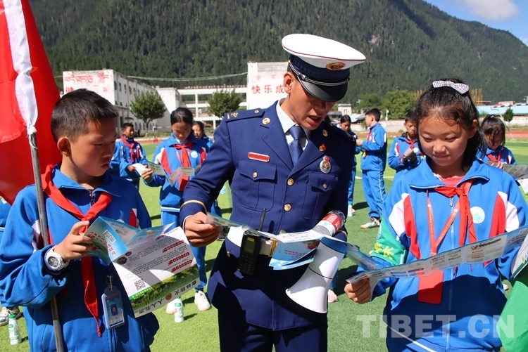 圖為執(zhí)勤分隊(duì)向?qū)W生開(kāi)展防火宣傳工作