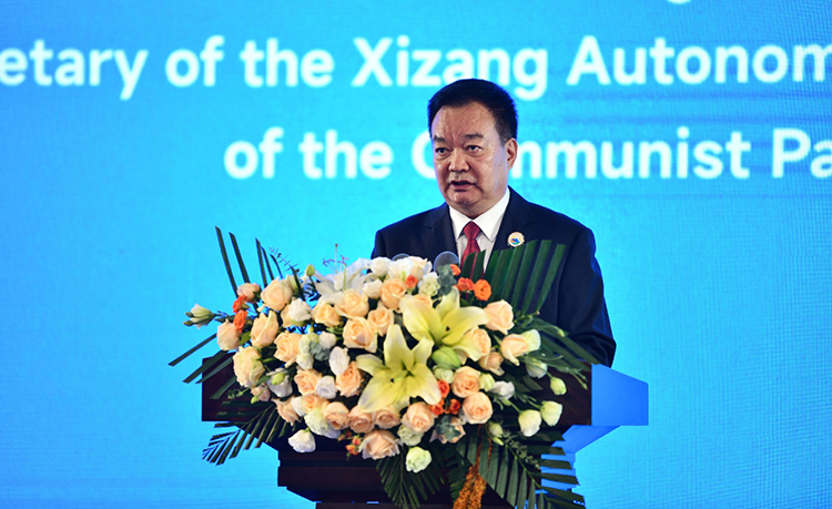 圖為開幕式暨主旨論壇現(xiàn)場西藏自治區(qū)黨委書記王君正在致辭 攝影:新華社記者晉美多吉