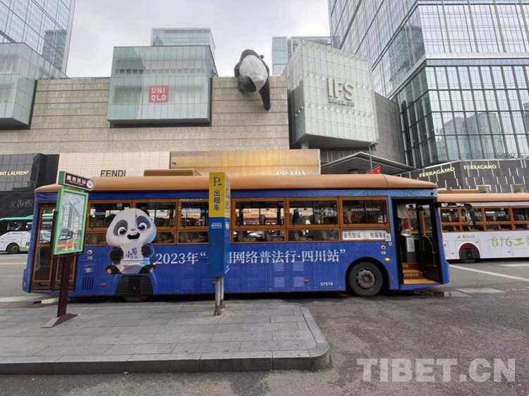圖為成都網(wǎng)紅地標(biāo)“熊貓爬墻”旁邊的“網(wǎng)絡(luò)普法公交車”