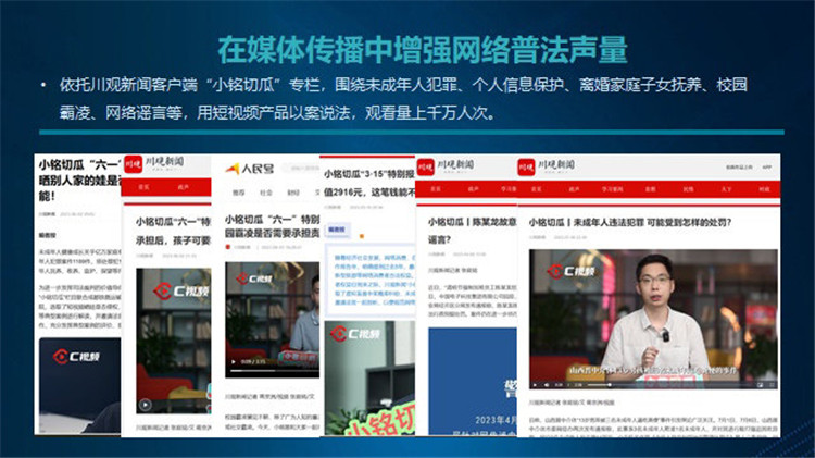 其中,四川省公安廳展示了如何運(yùn)用通俗易懂的網(wǎng)言網(wǎng)語(yǔ)和大眾喜聞樂(lè)見的方式傳播法治觀念,以及借助“熊貓反詐”IP,打造出一個(gè)權(quán)威、專業(yè)、有趣、有料的平臺(tái),讓反詐宣傳入腦、入心;成都市檢察院分享了如何通過(guò)“一個(gè)精品、二個(gè)示范、三個(gè)維度”,打造出多元“網(wǎng)絡(luò)普法”新模式。