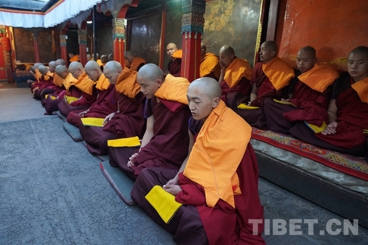 當(dāng)天清晨,扎什倫布寺桑煙繚繞、法號聲聲,28 位受戒的年輕僧人帶著新制袈裟,迎著朝霞依次走向拉讓殿等待班禪授戒這一神圣時刻的到來。8時許,在手持黃傘、香爐和吹嗩吶的高僧護送引領(lǐng)下班禪緩緩步入拉讓殿,并與在場僧眾集體誦經(jīng)。誦經(jīng)儀式結(jié)束后,班禪就坐于拉讓殿寶座,4名高僧大德作為授戒眾,開始為僧人閉門授戒、剃度、賜法名、摸頂。此時,受戒僧人一一入座,兩手在胸前交叉,聽班禪引證經(jīng)典告誡,并宣誓嚴守戒律。
