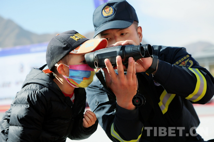 圖為啟動儀式現(xiàn)場拉薩消防指戰(zhàn)員向前來參觀的小朋友介紹測距儀