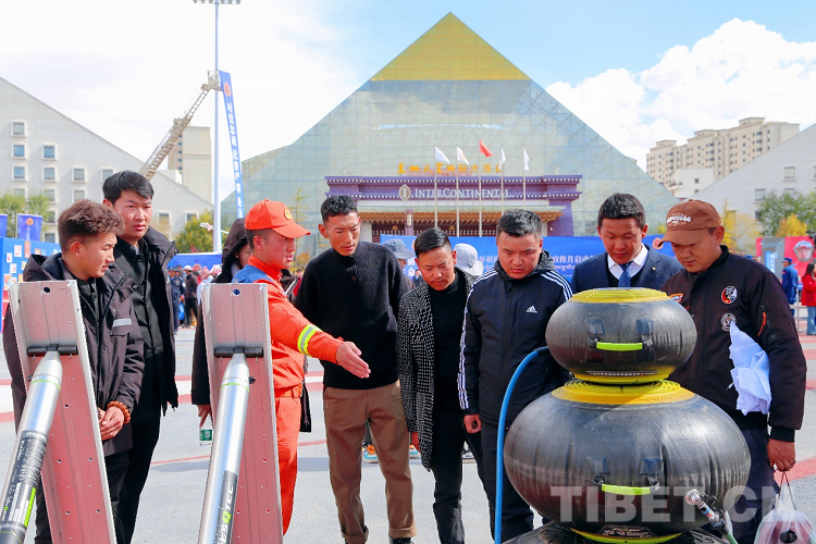 圖為啟動儀式現(xiàn)場拉薩消防指戰(zhàn)員向市民介紹高精尖裝備器材