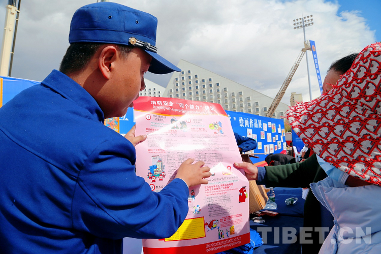 圖為啟動儀式現(xiàn)場拉薩消防指戰(zhàn)員向市民科普日常消防安全知識