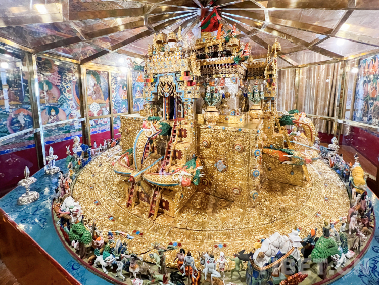 壇城,被稱作“曼荼羅”,是藏傳佛教密宗的重要元素,承載了豐富的象征意義和深刻的修行內涵,在藏傳佛教繪畫、寺院建筑、佛塔建筑、宗教法器、佛事活動中被廣泛采用,并形成了固定的模式和種類。 據(jù)扎什倫布寺僧人扎平介紹, “壇城從整體上來講有二維壇城、三維壇城之分,但按其造型形式,表現(xiàn)內容和使用材料可分為平面繪畫壇城、立體建筑壇城、彩砂彩粉浮雕壇城等多種類型。我們現(xiàn)在所看到的時輪壇城既是代表人體也是代表宇宙,它的每一個組成部分都與人體有著對應關系。它是用金、銀、銅、木頭等制成的立體法器壇城模型,就像立體的宮殿,這類壇城是作為密宗冥想法器,供陳列和膜拜使用。除此之外,還有金剛密法、喜經(jīng)剛兩座造型各異的壇城。殿堂頂部的壇城壁畫都是僧人以近乎于90度的立體筆觸繪制出來的,其難度可見一斑?!?nbsp;