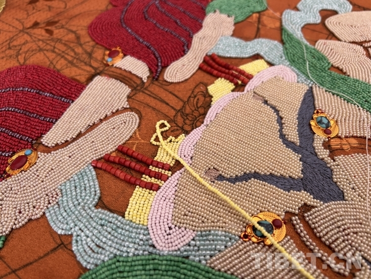 掌握了藏繡技藝,夫妻二人有了新的發(fā)展目標(biāo)。在傳承和發(fā)展傳統(tǒng)堆繡技藝的同時(shí),土旦想要?jiǎng)?chuàng)新更有特色的藏繡作品,于是創(chuàng)作“珍珠唐卡”的想法在他腦海中萌生?!爸韵胍?jiǎng)?chuàng)作珍珠唐卡,是因?yàn)橛写挝以谏侥系牟樗驴吹搅恕^世音菩薩憩息圖’這幅珍珠唐卡,我被它精美絕倫的制作工藝深深吸引,心想自己從事堆繡創(chuàng)作多年,也應(yīng)該去嘗試制作‘珠繡’作品了。”土旦向記者講述了他與珍珠唐卡的“結(jié)緣”經(jīng)歷。