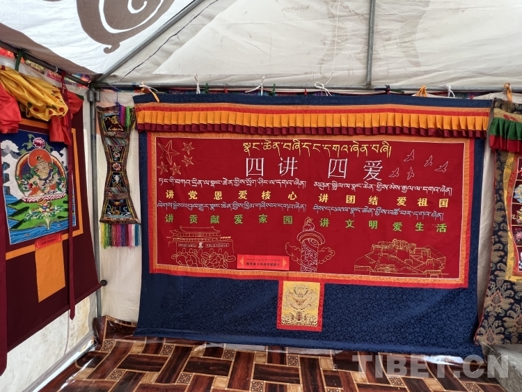 圖為夫妻二人繡制完成的雙語(yǔ)“四講四愛(ài)”藏繡作品。攝影:德吉卓瑪