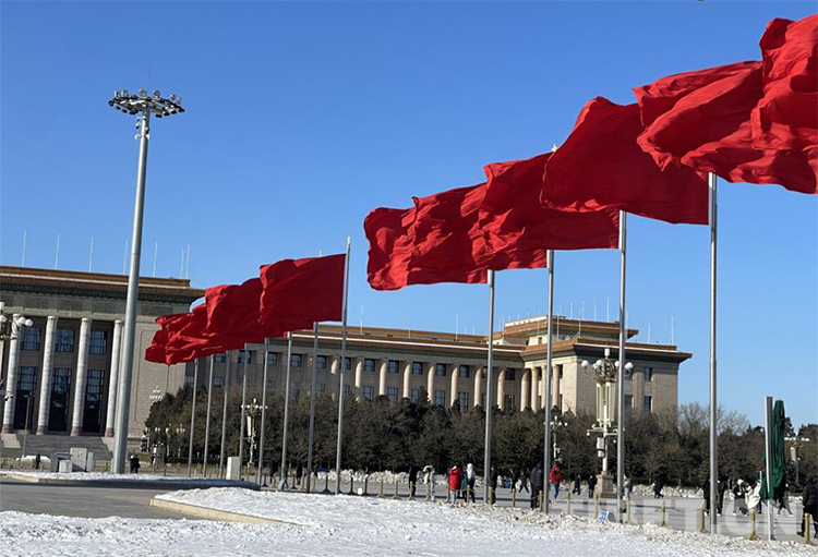 圖為天安門廣場上迎風(fēng)飄揚的紅旗 攝影:王妍丹