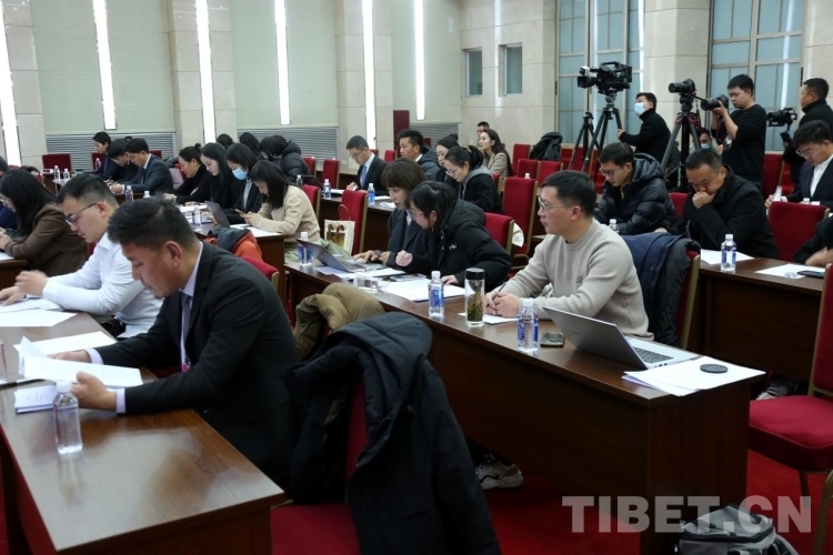 圖為中央駐藏媒體及西藏自治區(qū)媒體代表在會上認真聽取新聞發(fā)言人通報相關(guān)情況 攝影:王佳豪