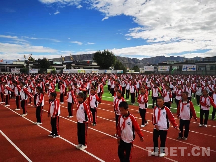 資料圖:日喀則市上海實(shí)驗(yàn)學(xué)校學(xué)生們正在跳具有民族特色的課間操