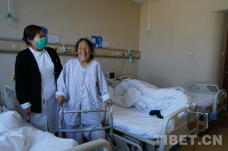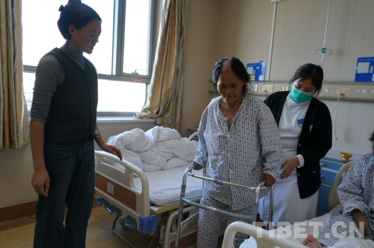 “卓瑪,你快給媽媽翻譯一下,用扶手架轉(zhuǎn)身的時候90度慢慢轉(zhuǎn),不要一次性轉(zhuǎn)180度,容易摔倒。”骨關(guān)節(jié)科護(hù)士薛小英從剛剛的驚慌中回過神來,對著29床病人布姆的女兒大聲叮囑道。就在剛才,這個來自洛隆縣59歲的右膝大骨節(jié)病患者布姆在骨關(guān)節(jié)手術(shù)24小時后,借助扶手架,在護(hù)士的指導(dǎo)下已經(jīng)能夠下床走路了。只是初次使用扶手架還不太熟悉,剛才180度的大轉(zhuǎn)彎讓一旁陪護(hù)的護(hù)士不禁捏了一把汗。女兒卓瑪聽到護(hù)士的話后趕忙告訴媽媽走路轉(zhuǎn)身要慢點,小心別摔倒。