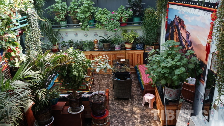德瓊家庭旅館以女主人次仁德瓊的名字命名。工作人員告訴我們,這里是拉康鎮(zhèn)生意最好的旅館之一。旅館位于兩條主干道交接的拐角,地理位置好,招牌也立得醒目,每個(gè)進(jìn)入鎮(zhèn)子的人第一眼就能看到德瓊家庭旅館的招牌。但生意好絕不僅僅是因?yàn)榈乩砦恢脙?yōu)越。走進(jìn)這間旅館,如同進(jìn)入一間溫室花棚。在這里,花草植物是絕對(duì)的主角,各色草本、藤本、灌木植物高低錯(cuò)落,幾乎填滿了墻壁空間。蕭瑟的冬日里,粉的、白的、紅的花朵擠擠挨挨地開著,茉莉、山茶、三角梅...來自不同地域的花卉植物在這邊境小鎮(zhèn)的一隅競(jìng)相綻放,天南海北在此握手言和。德瓊阿佳用她對(duì)生活的熱情將家庭旅館裝點(diǎn)得生機(jī)盎然,我想正是這份純真的熱愛才是德瓊家庭旅館生意火爆的關(guān)鍵所在。
