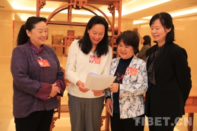 圖為全國兩會(huì)期間,界別小組會(huì)議時(shí),花德米(左二)與其他委員學(xué)習(xí)會(huì)議文件