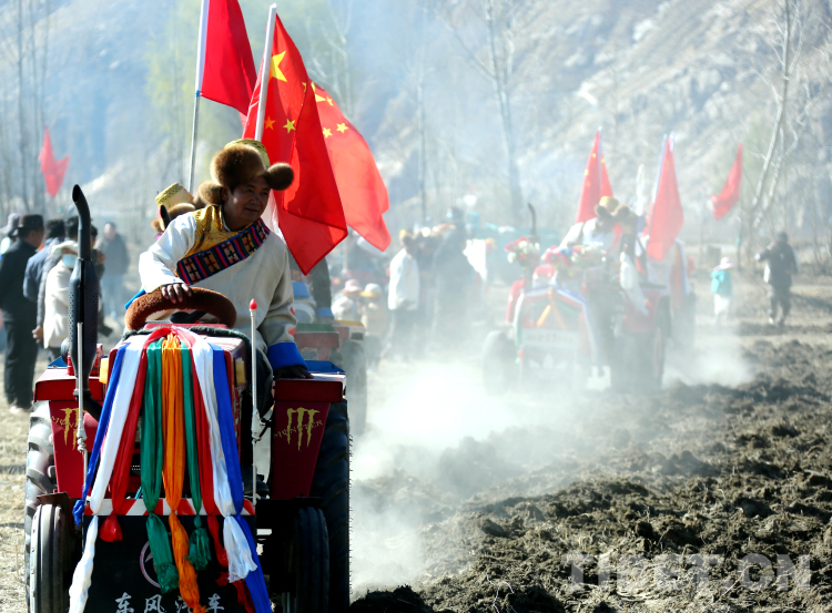 整個活動充滿儀式感。村民們先是來到田地中央燃桑香、獻貢品,祈求風(fēng)調(diào)雨順、無災(zāi)無害、莊稼豐收。開耕第一犁在吉祥喜慶的藏戲《扎西雪巴》表演中拉開了序幕,一輛輛插著五星紅旗,用五彩哈達、花朵、吉祥圖案裝扮一新的拖拉機一字排開,涌向待墾的農(nóng)田進行翻耕,播撒第一粒種子。