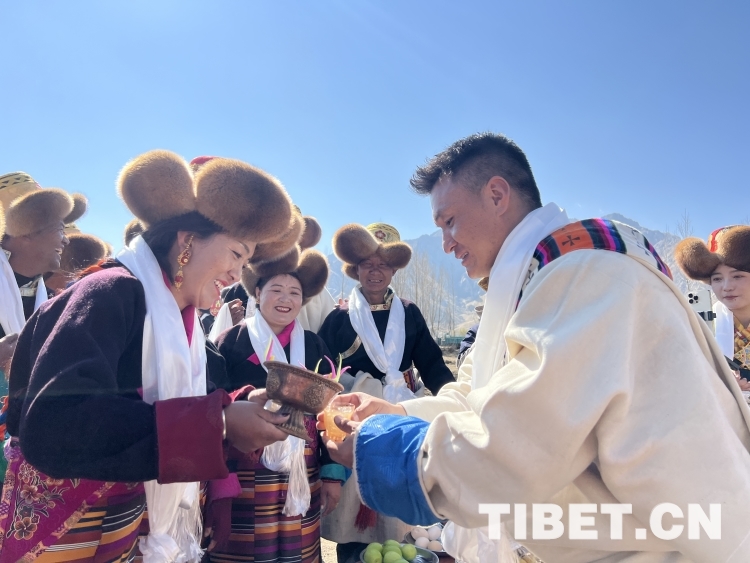 開耕儀式結(jié)束后,茶巴朗村藏戲隊成員們?yōu)樵缫褤Q好藏裝過來體驗西藏民俗文化的游客們獻哈達、敬青稞酒、唱敬酒歌,游客們現(xiàn)場學(xué)起“三口一杯”與當(dāng)?shù)厝斯捕冗@美好的一天。西藏卓美旅行社負(fù)責(zé)人孫赫男介紹說:“西藏除了山水美景之外,春耕儀式也是非常具有當(dāng)?shù)靥厣奈幕枺芙o人留下深刻記憶。今天,我?guī)е鴣碜员鄙蠌V等全國各地的游客來這里體驗春耕儀式,讓大家看看西藏當(dāng)?shù)氐娜罕娛窃鯓娱_始春天的。游客們穿著藏裝,免費品嘗青稞酒、酥油茶、牛肉、藏雞蛋等各種農(nóng)產(chǎn)品,還和充滿熱情的當(dāng)?shù)卮迕駛兓樱麄兺娴梅浅i_心?!?nbsp;