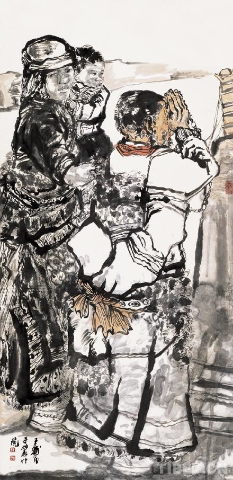 “真正深入當(dāng)?shù)厝ンw驗(yàn)藏族群眾的生活,創(chuàng)作出來的作品才會(huì)真實(shí)感人?!蓖踺o民在談到藏族題材的創(chuàng)作感悟時(shí)說,“青藏高原最吸引人的地方是生活在這里的人們飽滿的精神狀態(tài)。我們要敬畏自然,尊重文化,保持充滿感情、充滿崇敬之情的創(chuàng)作情感和態(tài)度,用中國畫的水墨形式去表現(xiàn)藏族群眾的生活,去表現(xiàn)雪域的蒼茫與藏族群眾頑強(qiáng)不屈的性格,表現(xiàn)人與自然的關(guān)系?!?/p>