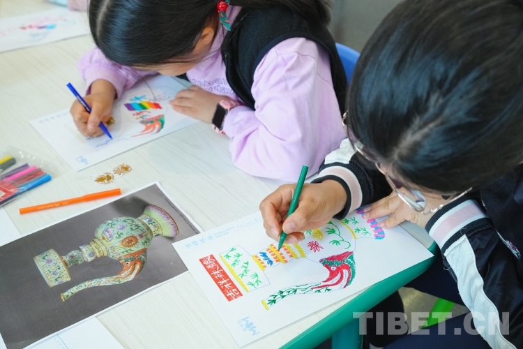 圖為參加“周日親子藝游”活動的學(xué)生在畫具有藏族文化特色的奔巴壺(圖片由澳門藝術(shù)博物館提供)