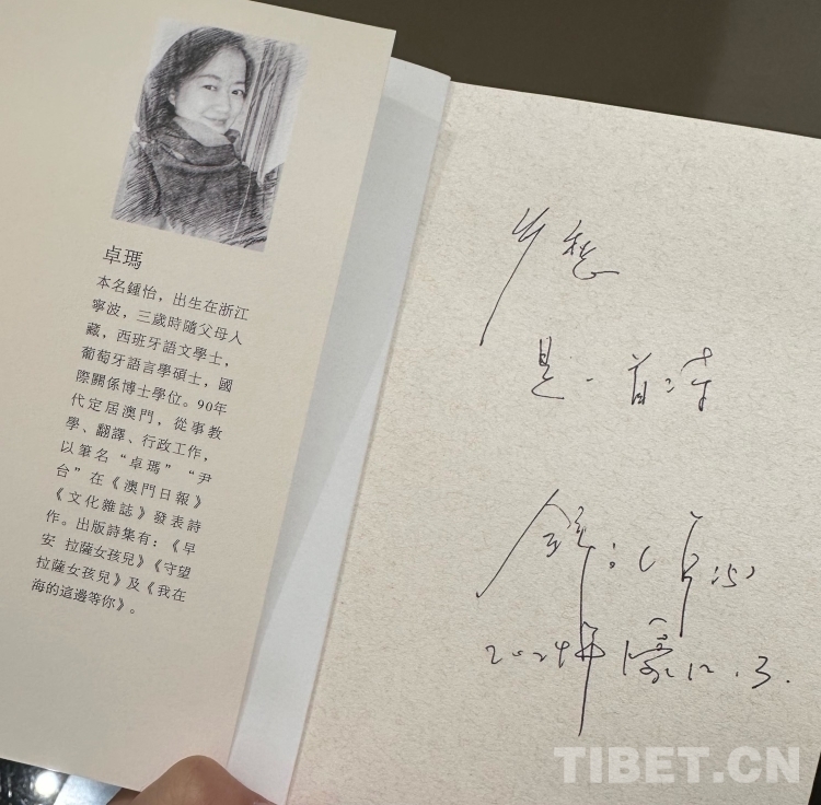 用餐結(jié)束后,卓瑪姐送我們每人一本她最新創(chuàng)作的詩(shī)集《昨天和明天都會(huì)回來(lái)》,并在扉頁(yè)親手寫(xiě)上寄語(yǔ),每人的寄語(yǔ)都不同。她在贈(zèng)予帕洛扎的書(shū)上寫(xiě)著“鄉(xiāng)愁,是一首詩(shī)”,給我寫(xiě)著“走著走著別把自己走丟了”,給浩然寫(xiě)著“別輕視 弱小的溫柔”……每條寄語(yǔ),都寄托著卓瑪姐他鄉(xiāng)遇故知的溫暖與感動(dòng)。對(duì)于西藏,我想卓瑪姐與帕洛扎一樣,都已經(jīng)把它當(dāng)成了自己深?lèi)?ài)的故鄉(xiāng)。西藏承載著她兒時(shí)的記憶,小時(shí)候居住過(guò)的水泥廠、上學(xué)時(shí)走過(guò)的路、拉中的老師同學(xué)……那些或欣喜或難忘的往事,都是她與西藏這片土地最真實(shí)的情感連接,這種情懷,無(wú)法割舍,更不能割舍。(中國(guó)西藏網(wǎng) 記者/呂靜 易文文 姚浩然 王東)