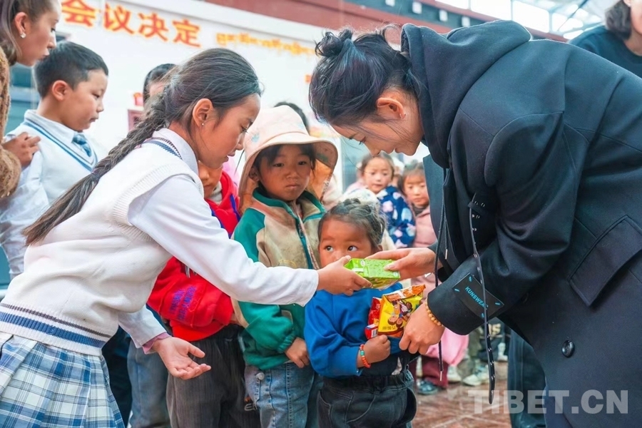 圖為洛桑卓瑪帶著自己拉薩的學(xué)員在日喀則市定日縣扎西宗鄉(xiāng)拉木堆村給當(dāng)?shù)睾⒆觽兎至闶场 ?/p>