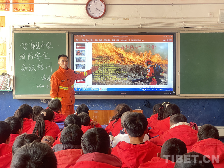 在芒康縣中學授課現(xiàn)場,芒康縣森林消防分隊負責人夏能向全校師生講解森林防火的重要意義、火災的起因、相關(guān)法律法規(guī)和常用防火知識等,教育引導同學們樹立森林防火意識,做到不帶火種進山,發(fā)現(xiàn)火情及時報警。