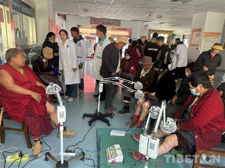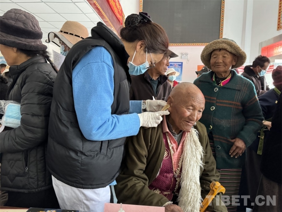 圖為洛隆縣藏醫(yī)院及人民醫(yī)院的醫(yī)療團隊在現(xiàn)場開展平衡火罐、艾灸等中醫(yī)診療服務 供圖:洛隆縣藏醫(yī)院