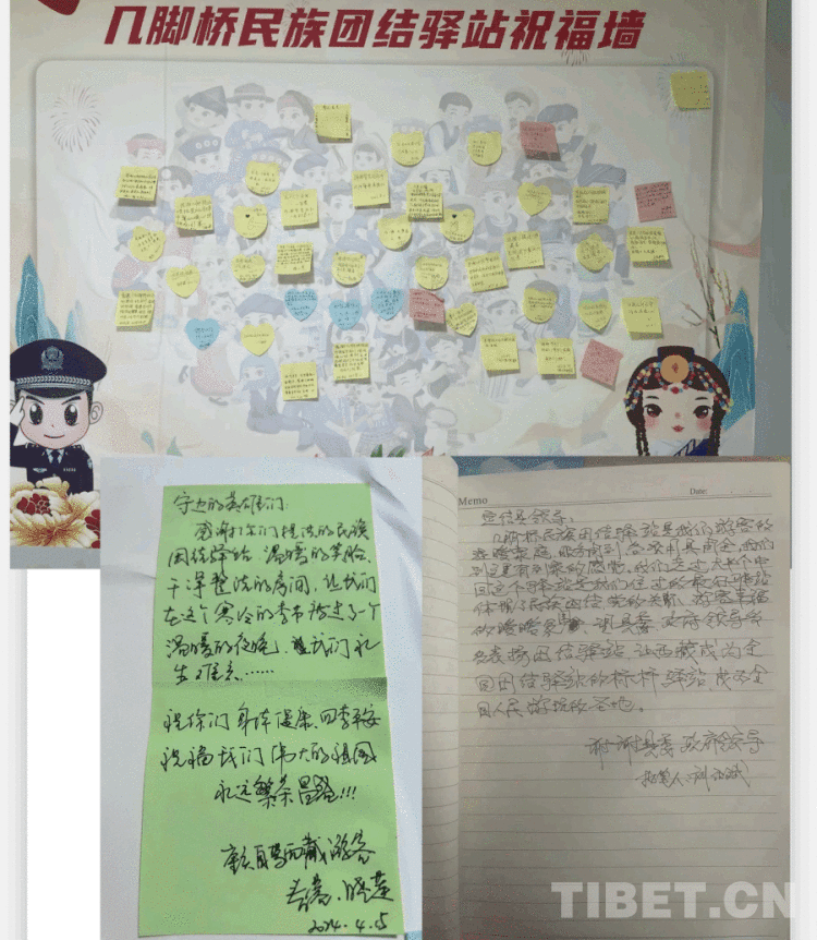 記者在社交媒體上也看到了很多游客以視頻、圖文等形式分享了他們和幾腳橋民族團(tuán)結(jié)驛站的故事?!耙驗楫?dāng)?shù)靥厥庠蛭覀兊娇h城沒有地住了,在小紅書上看到這個驛站可以留宿,實在沒有辦法去邊防檢查站詢問。邊防小哥哥了解原因后特別暖心立馬給我們安排住宿,洗漱用品樣樣不差,太贊啦!這是我這一路旅行睡得最香的一晚,主要還免費!”一位游客半調(diào)侃地分享了自己的故事,還加了三張夜拍驛站的圖片。一張用外景,在夜里,“幾腳橋民族團(tuán)結(jié)驛站”漢藏雙語大牌十分醒目;一張室內(nèi)環(huán)境,左右兩邊的上下鋪床上放著四個“豆腐塊”被子,床單潔白如新,中間的小桌子上還放著氧氣罐、雜志、臺燈等用品;一張貼滿祝福與感謝的“便簽墻”……張張圖片體現(xiàn)了驛站工作人員的用心良苦,也定格著他難忘的定結(jié)記憶。